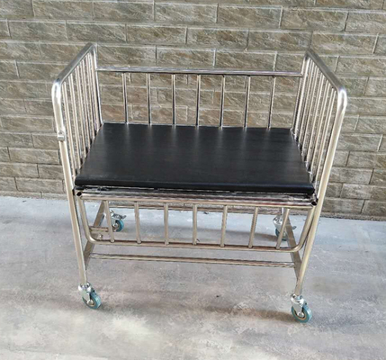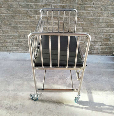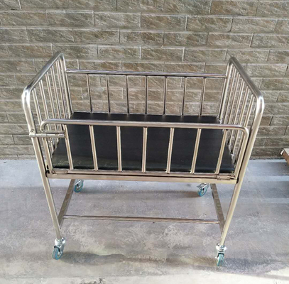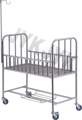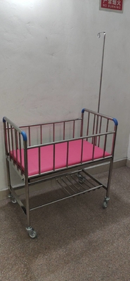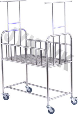 A durable stainless steel baby bassinet designed for hospital use, featuring a comfortable mattress, IV stand, and four castors (two with brakes) for easy mobility. Ideal for infant care in medical facilities.